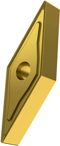 Doppelseitige negative Drehwendeschneidplatte · 35° Rhombisch mit Innenkreisdurchmesser von 9.525mm · 4.76mm Dick · 0.4mm Radius · Indexgenauigkeit nach ISO-Toleranzklasse-M · Spanbrecher NM mit verrundeter Schneidkante · im Substrat T8315 · PVD beschichtet WC-Co Feinkornsubstrat im ISO-Bereich M05 -M20 · zum schlichten bis schruppen bearbeiten von nichtrostenden Stählen