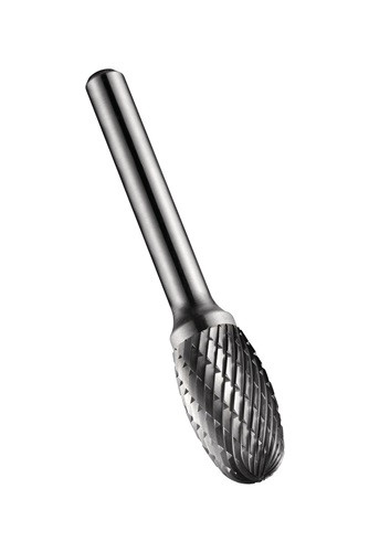 Ovaler Frässtift (Form E) · Durchmesser 9.6mm mit 16mm Schnittlänge · 60mm Gesamtlänge und 6mm Schaft · VHM mit gehärtetem Stahlschaft und blanker Oberfläche · DC doppelseitigem Schnitt mit enger Zahnteilung zur runden Kantenformung in Stahl und Stahlguss · Edelstahl · Gusseisen · Kupfer oder Kupferlegierungen · Hochwarmfeste Legierungen · gehärtete Materialien