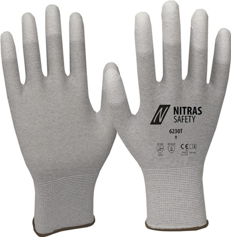 nach EN 388 · EN 16350 · Kat.II · Material: Nylon-Carbon-Strick · grau · weiße PU-Beschichtung auf den Fingerkuppen · mit Strickbund · eingearbeiteter Carbonfaden · gute Fingerfertigkeit · touchscreenfähig · farbliche Größenkennung