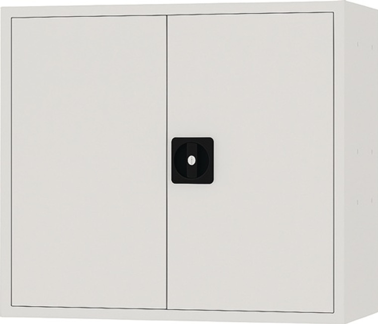 zwei Flügeltüren · Flügeltür innenliegend, bündig mit Gehäuse · Türöffnungswinkel ca. 100° · Fachboden aus verzinktem Stahlblech · Griffschalenschloss inkl. 2 x Schlüssel · Verriegelung seitlich · Blechstärke 1 mm · Tragfähigkeit 35 kg · zur Wandbefestigung