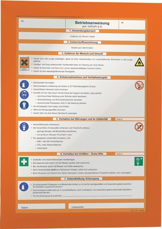 selbstklebend · mit vollflächiger Selbstklebefolie auf der Rückseite, zur Anbringung auf glatten Oberflächen · der Rahmen lässt sich rückstandslos lösen und an anderer Stelle wieder anbringen · Rahmen beidseitig farbig · einfaches und schnelles Austauschen durch aufklappbare, magnetische Vorderseite · auf Glasflächen beidseitig lesbar · VE = 2 Stück · Zur Aufnahme von Brandschutzverordnungen - rot Betriebsanweisungen für Maschinen - dunkelblau oder Betriebsanweisungen gem. GefStoffV - orange