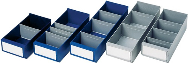 aus hochschlagfestem Polystyrol · ideal zur Lagerung von Kleinteilen in Regalsystemen · mit stirnseitigem Griff und integrierter Auszugssperre · variabel einsetzbar durch umsteckbare Trennwände (Zubehör) · extra großes Etikettenfeld (Etiketten s. Zubehör)