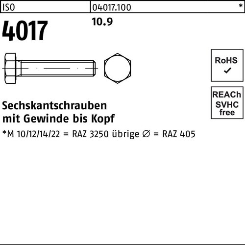 ISO 4017 10.9 Sechskantschrauben mit Gewinde bis Kopf - Abmessung: M 20 x 100 VE=S (25 Stück)