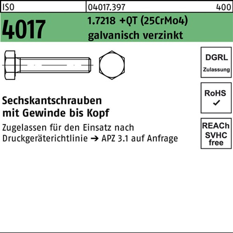 ISO 4017 1.7218 +QT (25CrMo4) galvanisch verzinkt Sechskantschrauben mit Gewinde bis Kopf - Abmessung: M 24 x 35 VE=S (25 Stück)