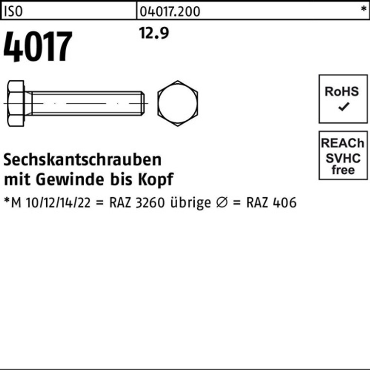 ISO 4017 12.9 Sechskantschrauben mit Gewinde bis Kopf - Abmessung: M 8 x 60 VE=S (200 Stück)