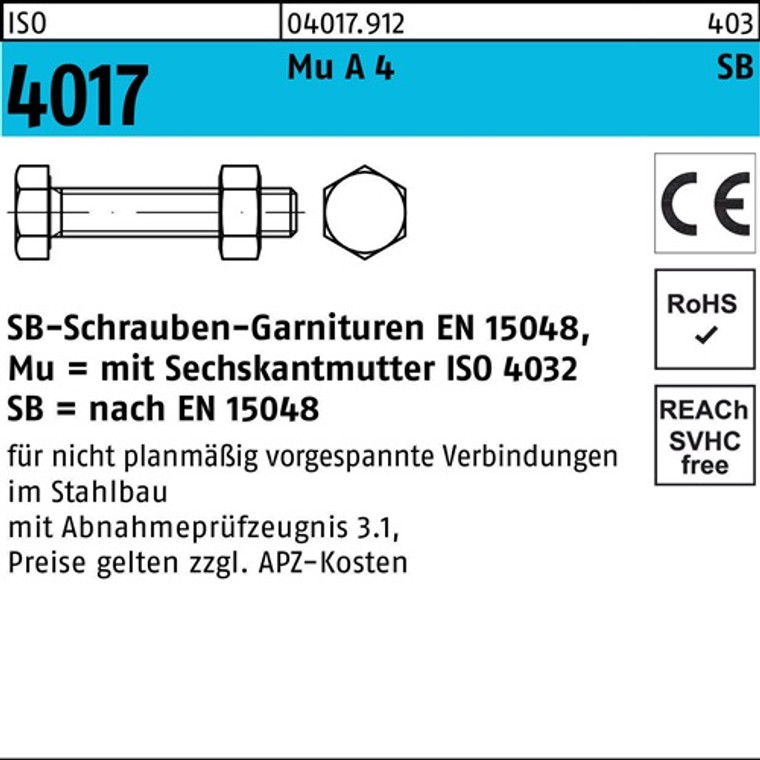 ISO 4017 Mu A 4 SB SB-Schrauben-Garnituren EN 15048 · mit Sechskantmutter ISO 4032 - Abmessung: M 24 x 60 VE=S (10 Stück)