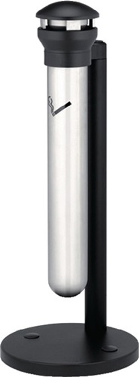 aus Edelstahl · Ständer aus Stahlblech und schwarz beschichtet · wetterfest - geschwungener Verschluss verhindert Eindringen von Regenwasser · Bodenplatte lässt sich am Boden festschrauben · großes Fassungsvermögen, leicht zu entleeren