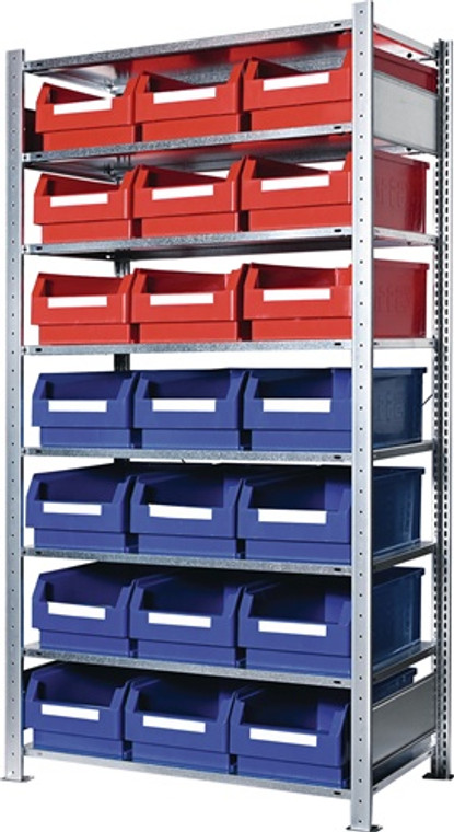komplett mit Sichtlagerkästen Raster-Plan°· einfache und schnelle Steckmontage mit vormontierten verzinkten Rahmen · Fachböden verzinkt mit verstärktem Kastenprofil, H 25 mm, höhenverstellbar im 25-mm-Raster · Tragfähigkeit pro Fachboden 150 kg · Feldlast 1300 kg Regalaußenmaße: Grundregal + 60 mm, Anbauregal + 6 mm, Tiefe + 36 mm Sicherheitshinweis: Regale mit einem Höhen-/Tiefenverhältnis ≥ 4:1 müssen durch geeignete Wand- oder Fußbefestigungen gegen Kippen gesichert werden.